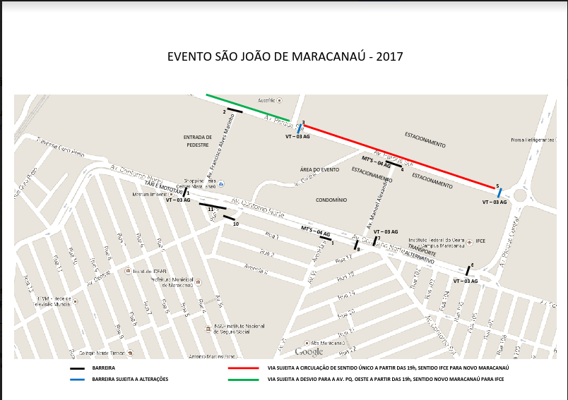A Prefeitura de Maracanaú, através do Departamento Municipal de Trânsito e de Transportes – Demutran, fará mudanças no trânsito em torno da Cidade Junina, onde será realizado o São João de Maracanaú. Nos dias de shows, 1º, 3, 8, 9 e 10, a partir das 18 horas, a Avenida I, entre o IFCE e o Feira Center Shopping, será interditada, bem como as Avenidas Francisco Alves Marinho e Manoel Alexandre. A Avenida Parque Sul estará sujeita a sentido único (do IFCE para o Novo Maracanaú) e aqueles motoristas que circularem por essa via, sentido Novo Maracanaú para Fortaleza, estarão sujeitos a desvio pela Av. Parque Oeste. (Oswaldo Scaliotti)