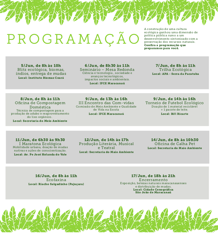 Diversas ações serão realizadas em todo o Município, como Exposição Fotográfica, Distribuição de Mudas de Espécies Arbóreas Nativas, Blitze Ecológicas com distribuição de material educativo, Passeio Ciclístico, Torneio de Futebol, Palestras e um estande na Cidade Cenográfica do São João de Maracanaú.