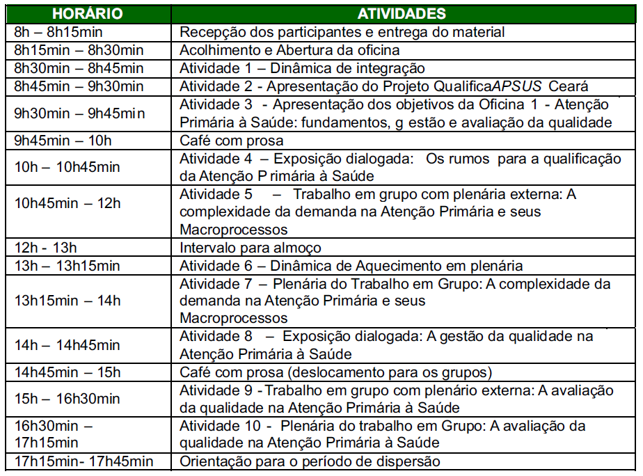 Para o lançamento do projeto QualificaAPSUS, Maracanaú sediará a primeira oficina intitulada – Atenção Primária à Saúde: Fundamentos, Gestão e Avaliação da qualidade, com o objetivo de compreender os fundamentos da Atenção Primária em Saúde – APS e avaliação da qualidade na APS, possibilitando a reorganização do processo de trabalho e melhoria do acesso aos serviços de saúde na Atenção Primária.