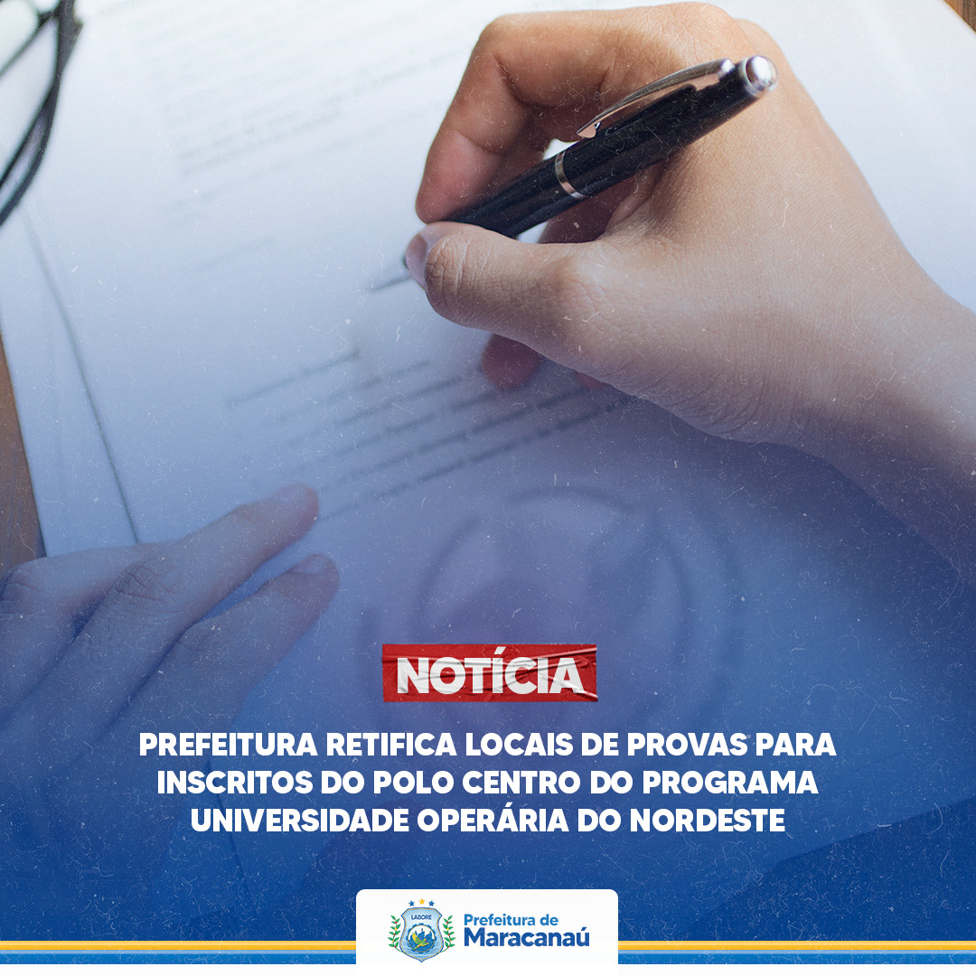 A Prefeitura de Maracanaú, através da Secretaria de Educação, divulgou nesta segunda-feira, 12 de abril, retificação dos locais de prova para inscritos do Polo Centro do Programa Universidade Operária do Nordeste. O candidato deverá acessar o site da Prefeitura de Maracanaú para conferir o local de prova. Os inscritos para o Polo Pajuçara não tiveram os locais de provas modificados.